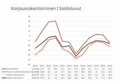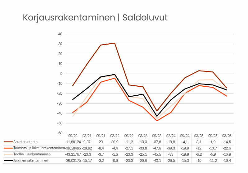 Korjausrakentamisen näkymät ovat kokonaisuutena heikentyneet syksystä. Asuntojen korjausrakentamisen saldoluku on painunut jälleen selvästi miinukselle (syksyllä 1,9 ja keväällä -14,5), ja myös muilla osa-alueilla korjausrakentamisen odotetaan vähenevän.