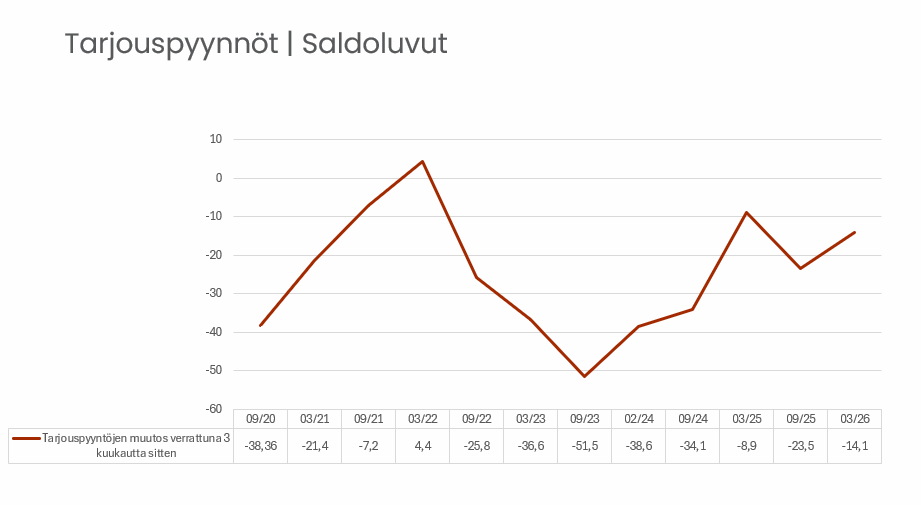 Tarjouspyyntöjen määrä on kokonaisuutena vähentynyt, mutta tilanne on hieman parempi kuin syksyllä. Suurimmat toimijat raportoivat tarjouspyyntöjen lisääntyneen voimakkaasti, kun taas pienemmillä yrityksillä kehitys on päinvastainen.