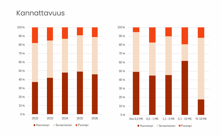 Kannattavuuden kehityksen osalta odotukset ovat hieman parantuneet syksystä. Kuitenkin kaksi viidestä vastaajasta arvioi kannattavuutensa heikkenevän. Heikoimmat kannattavuusnäkymät ovat sähköurakoitsijoilla, ja alueelliset erot ovat merkittäviä.