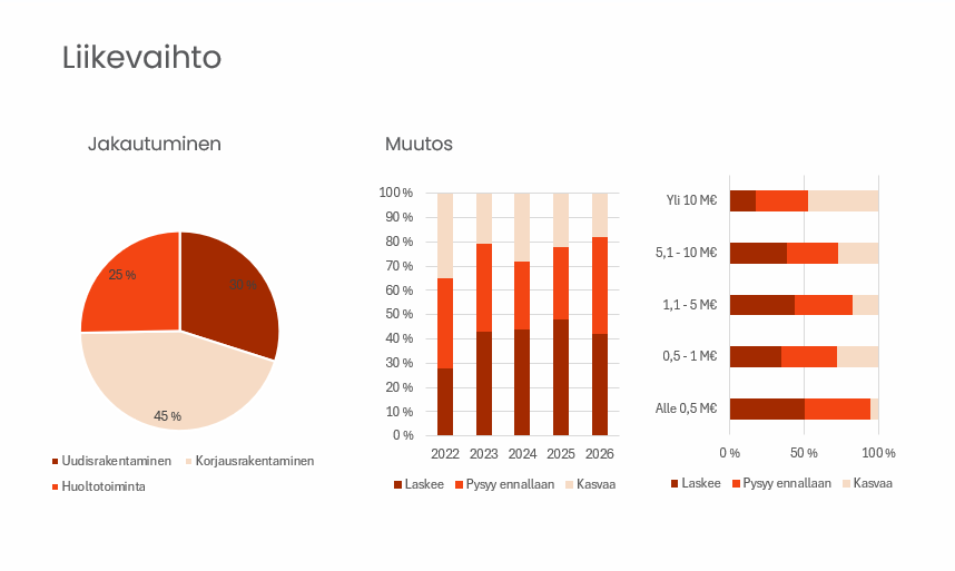 Myös huoltotoiminnan osalta odotukset ovat heikentyneet syksystä, ja saldoluku on painunut aavistuksen negatiiviseksi (syksyllä 8,4 ja keväällä -2,9). Huoltomarkkinan näkymät ovat kuitenkin korjausrakentamista tasaisemmat, ja kasvua ennakoidaan erityisesti 0,5–1 miljoonan euron liikevaihtoluokassa sekä isoimmilla toimijoilla.