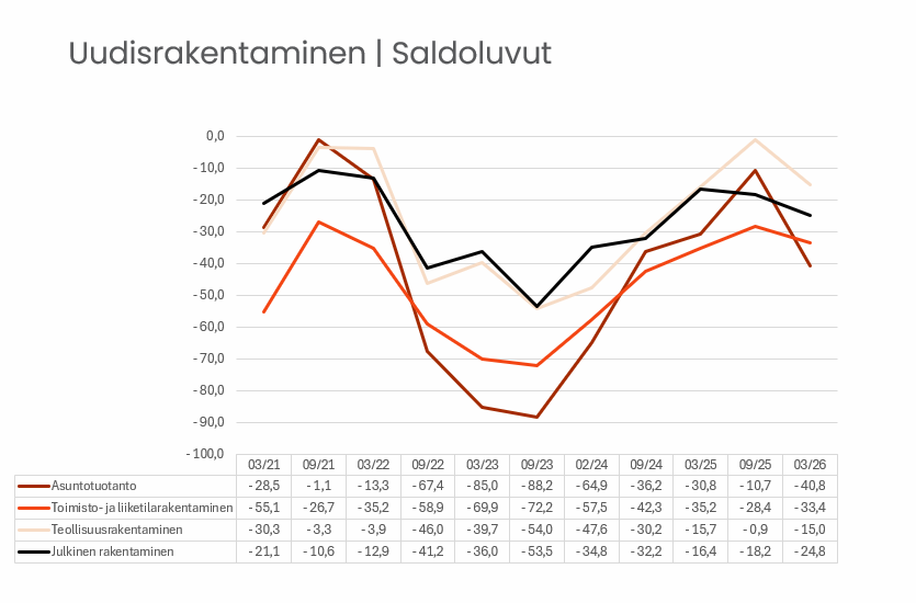 Uudisrakentamisen näkymät ovat heikentyneet selvästi syksystä kaikilla uudistuotannon osa-alueilla. Erityisesti asuntorakentamisessa muutos on ollut voimakas, ja keväällä alkanut varovainen positiivinen kehitys on kääntynyt uudelleen laskuun (saldoluku syksyllä -10,7 ja keväällä -40,8). Teollisuusrakentamisen saldoluku on muita osa-alueita parempi, mutta sekin on edelleen selvästi negatiivinen (-15).