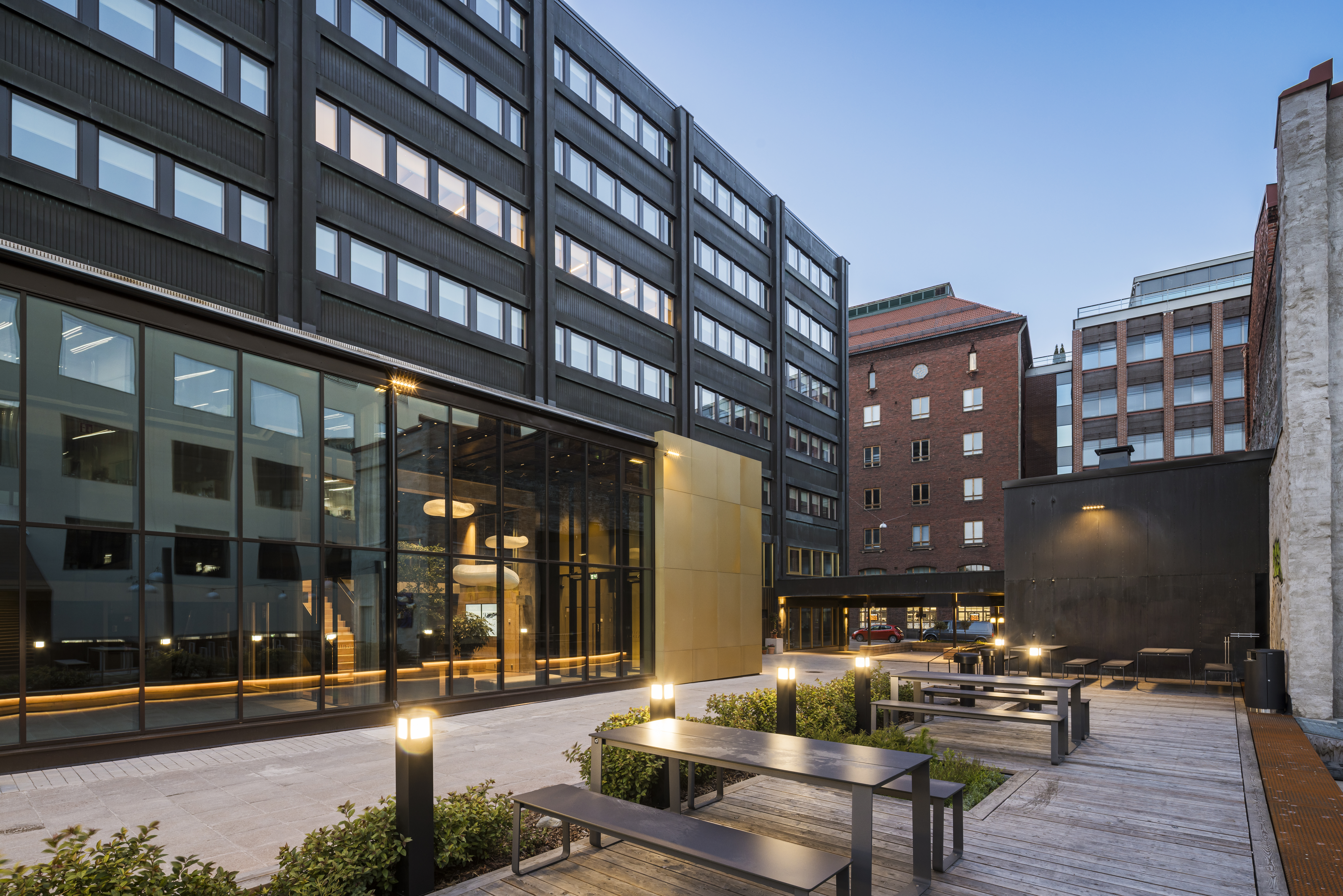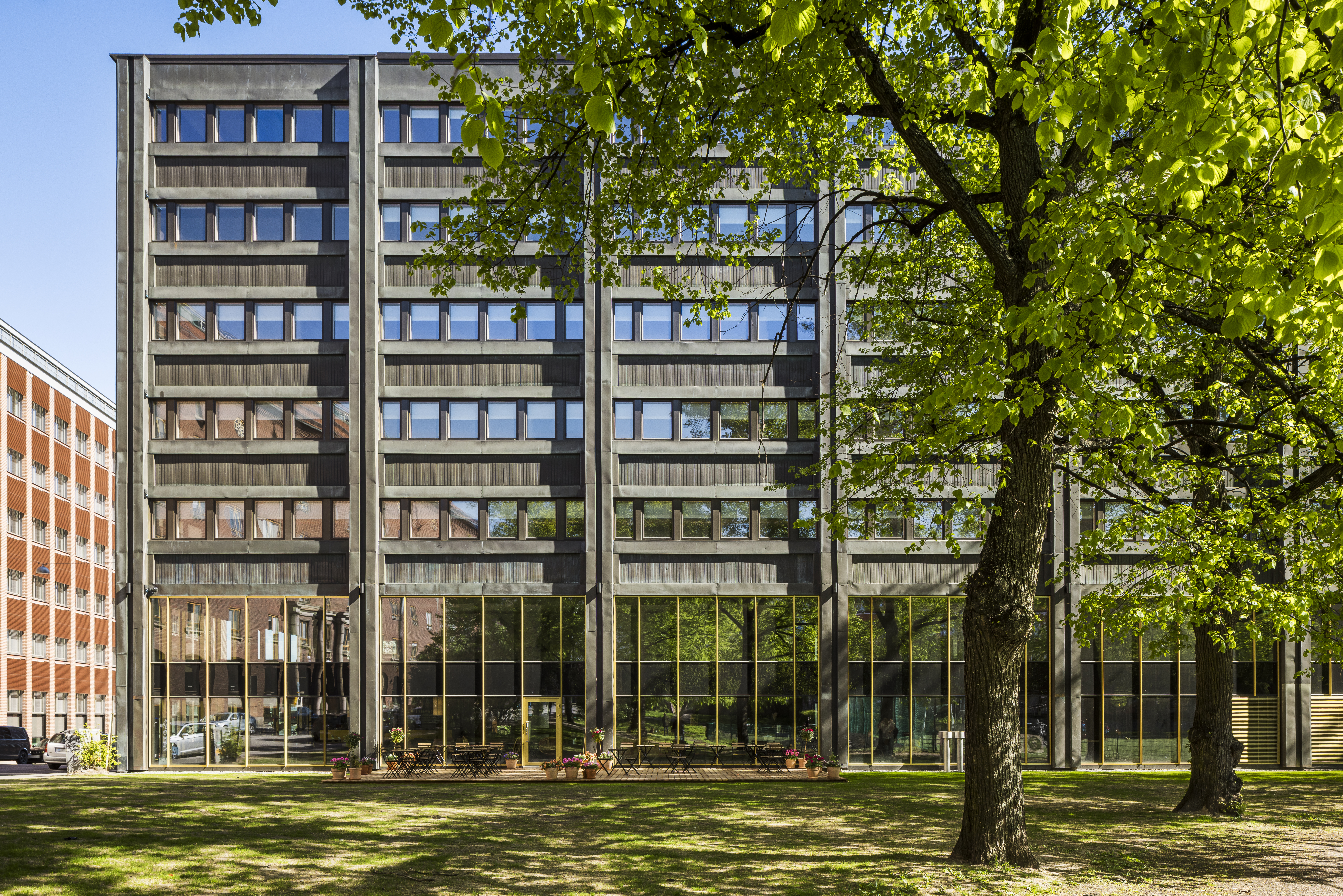 Toimistotalon näkyvin uudistus on kaksikerroksinen laajennus, johon sijoittuvat uusi pääsisäänkäynti ja aula. Samalla rakennuksen alakerroksia avattiin, ja ensimmäiseen kerrokseen toteutettiin ravintola terasseineen. Ravintolan kiintokalusteissa ja seinäverhouksissa käytettiin pääprojektin ylijäämämateriaaleja.