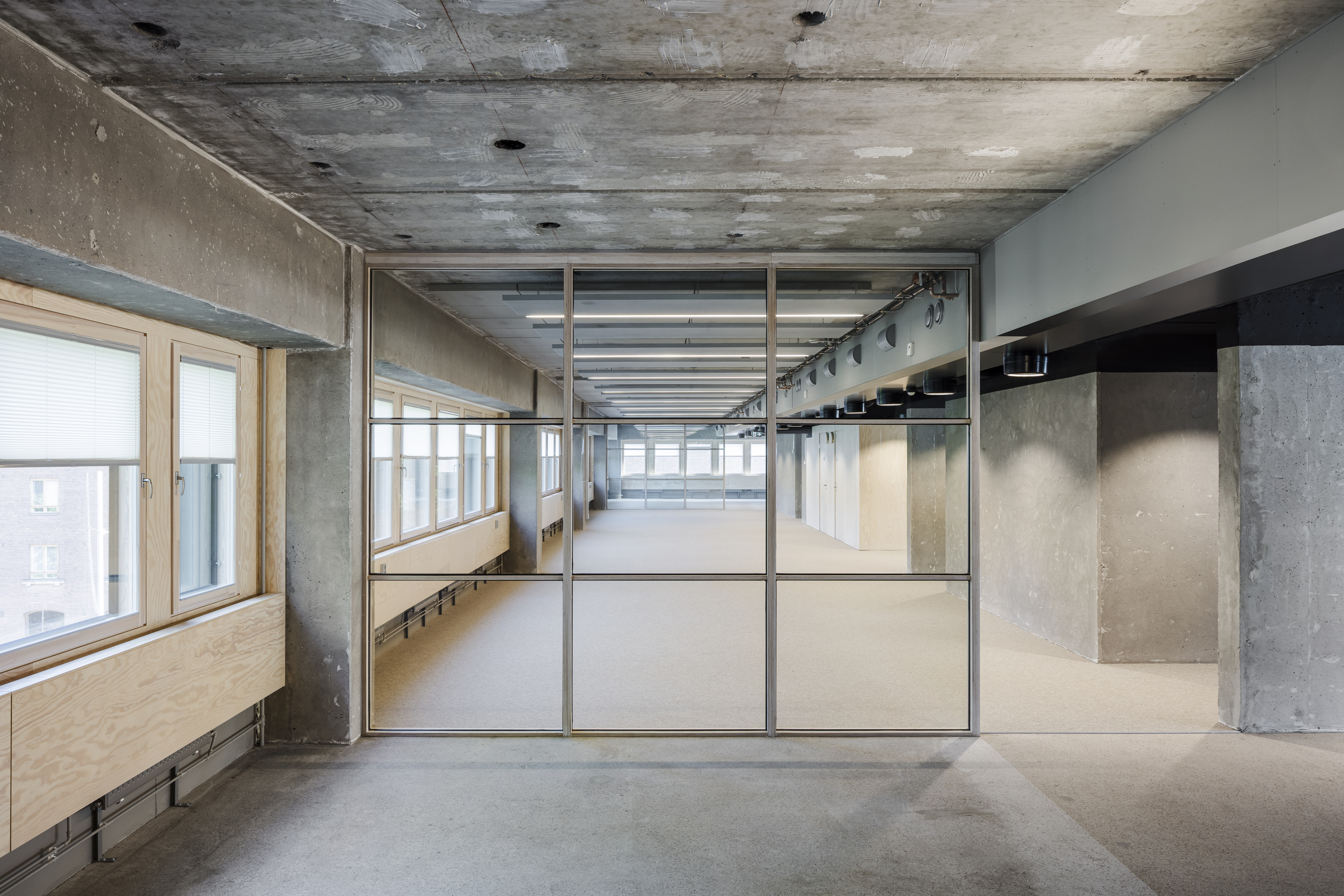 Muutossuunnittelussa hyödynnettiin innovatiivisesti vanhoja ikkunoita: parikymmentä vuotta vanhat eristyslasielementit purettiin julkisivusta ehjinä ja käytettiin toimiston siirrettävinä lasiväliseininä. Näin hiilijalanjälki saatiin puoleen verrattuna uusiin seiniin.
