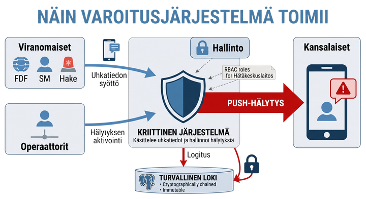 Valtio tarttui asiaan ja ilmoitti rakentavansa kyseisen sovelluksen – mutta aikatauluksi ilmoitettiin lähes kaksi vuotta. Sisäministeriön, Puolustusvoimien ja Hätäkeskuslaitoksen yhteinen SIREN-hanke kestää joulukuuhun 2027 asti. SIREN on osa valtion 6,5 miljoonan euron vaaratiedottamisen kehittämiskokonaisuutta. Aikataulua on perusteltu kansainvälisillä vertailukohdilla – muualla vastaavien järjestelmien rakentaminen on vienyt 1,5–2 vuotta.