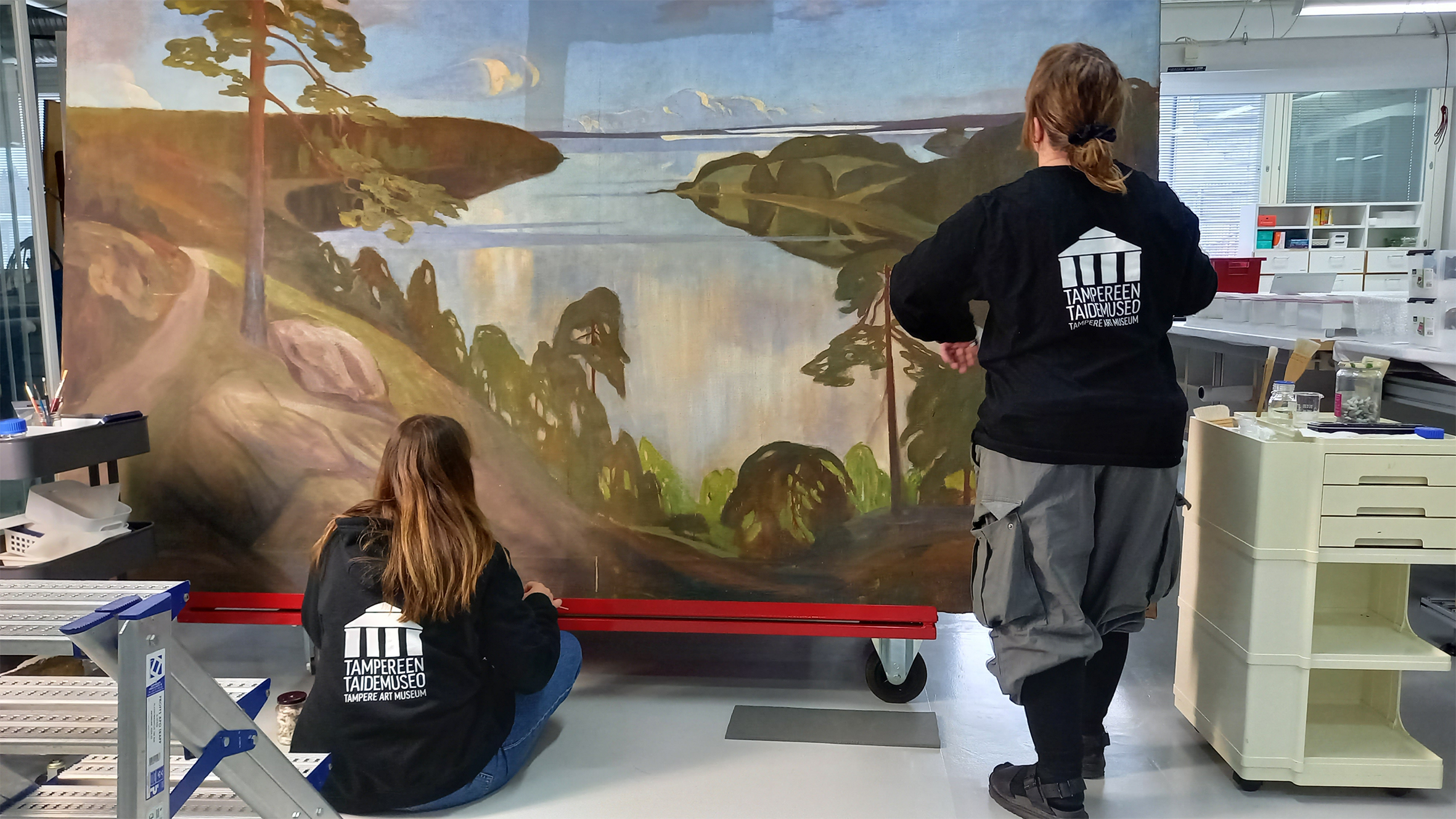 Germund Paaerin maisemamaalaus tilattiin näyttämökulissiksi, ja se sai vuosikymmenien ajan toimia myös luokkakuvien taustana sekä luokkahuoneen kaunistuksena. Maalaus oli esillä 1903–1942 Pispalassa, ns. Sipilän pikkukoulun ainoan luokkahuoneen takaseinällä. Koulun toiminnan loppuessa maalaus siirrettiin Hyhkyn kouluun, missä se on ollut viimeisten 80 vuoden ajan. Vuonna 2020 maalaus siirrettiin Kokoelmakeskukseen konservoitavaksi. Tampereen taidemuseon kokoelmayksikössä teokseen vaihdettiin uusi kehys, paikattiin sen repeämät, suoristettiin kangas ja puhdistettiin koko maalaus.