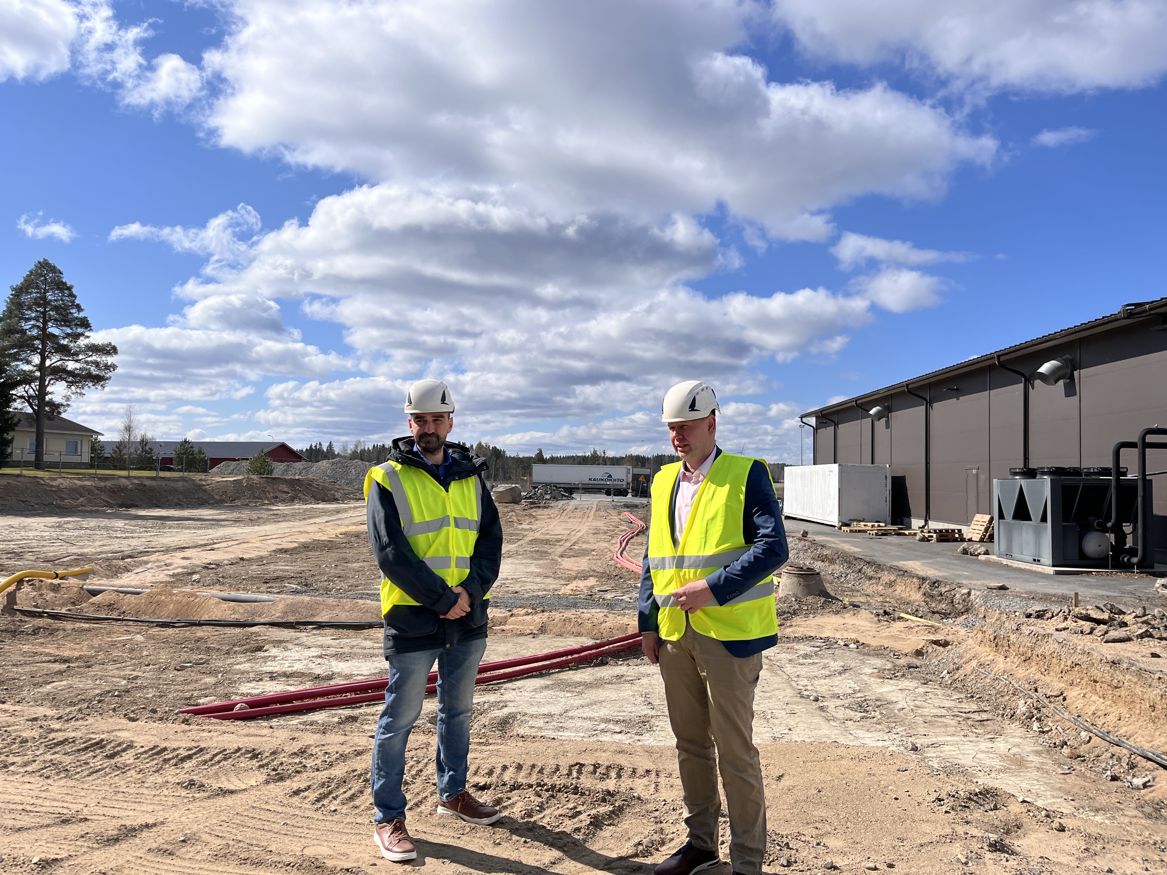 Johtaja Niklas Keski-Kasari (vas.) ja tuotantopäällikkö Marko Viitala tulevan varastolaajennuksen edessä
