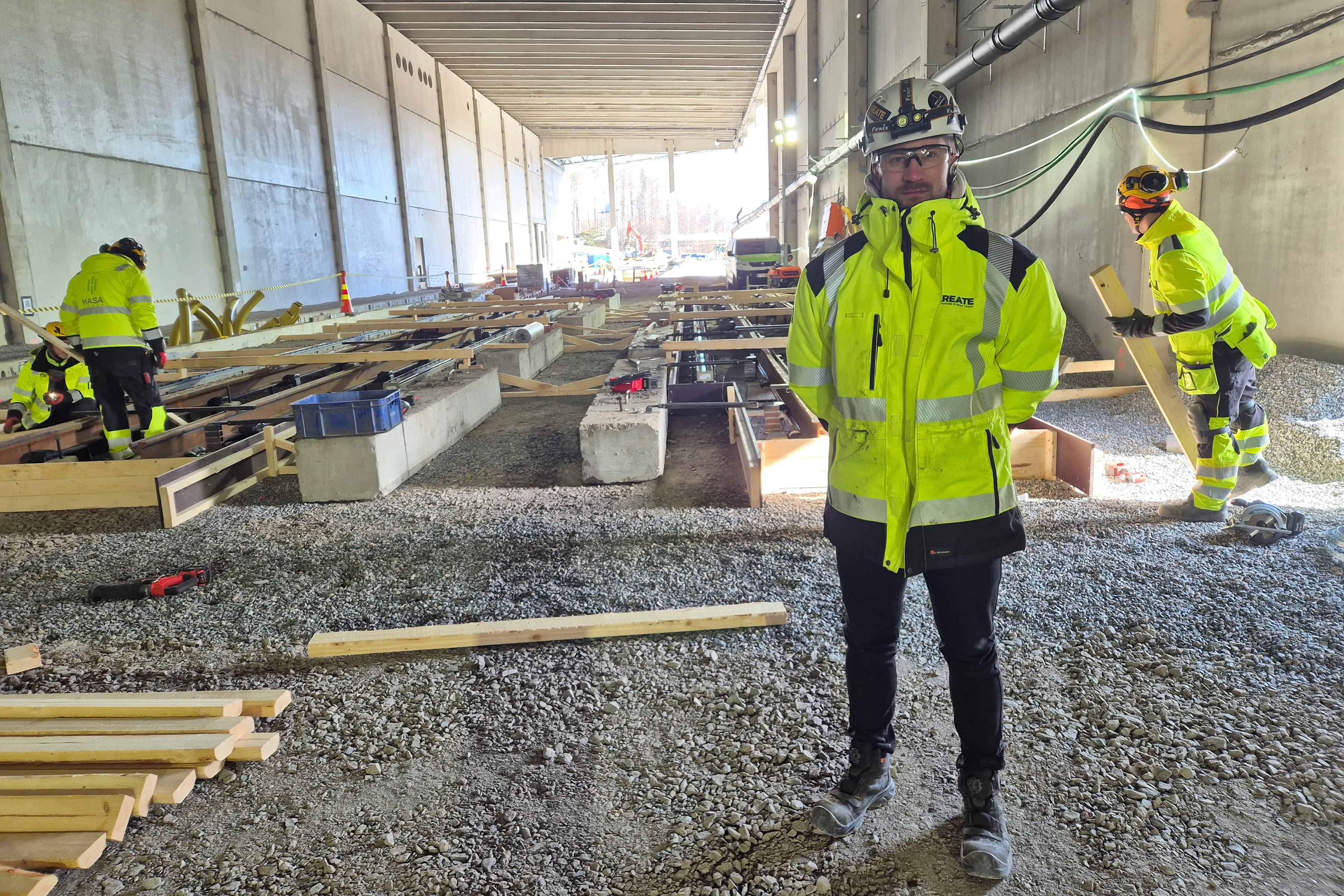 – Kreaten töiden rytmitys etenee siten, että infratyöt ovat koko ajan edellä, rata tulee perässä ja tämän jälkeen toteutetaan lattiatyöt eli meillä korostuu omien töidenkin yhteensovitus, kun pienellä alueella tehdään monia työvaiheita yhtä aikaa. Töiden tiivis limitys pakottaa meidät myös suunnittelemaan työt tarkasti etukäteen, mikä näkyy aikataulun lisäksi myös positiivisesti laadussa ja turvallisuudessa, kertoo hankkeella Kreaten töiden työmaapäällikkönä toimiva Mikko Koponen.
