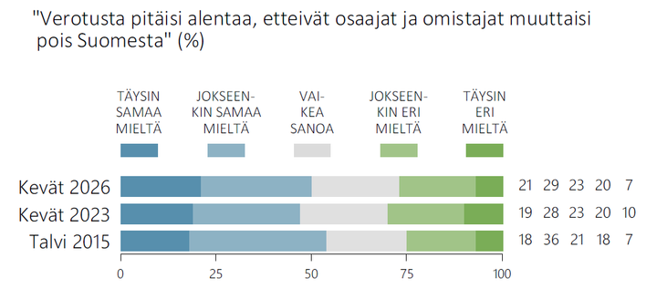 Suomalaiset pitävät tärkeänä, ettei liian ankara verotus karkota osaajia ja omistajia maasta. Puolet (50 %) katsoo, että verotusta pitäisi alentaa, etteivät osaajat ja omistajat muuttaisi pois Suomesta. Joka neljäs (27 %) on väitteestä eri mieltä ja lähes yhtä moni (23 %) ei ota asiaan kantaa.