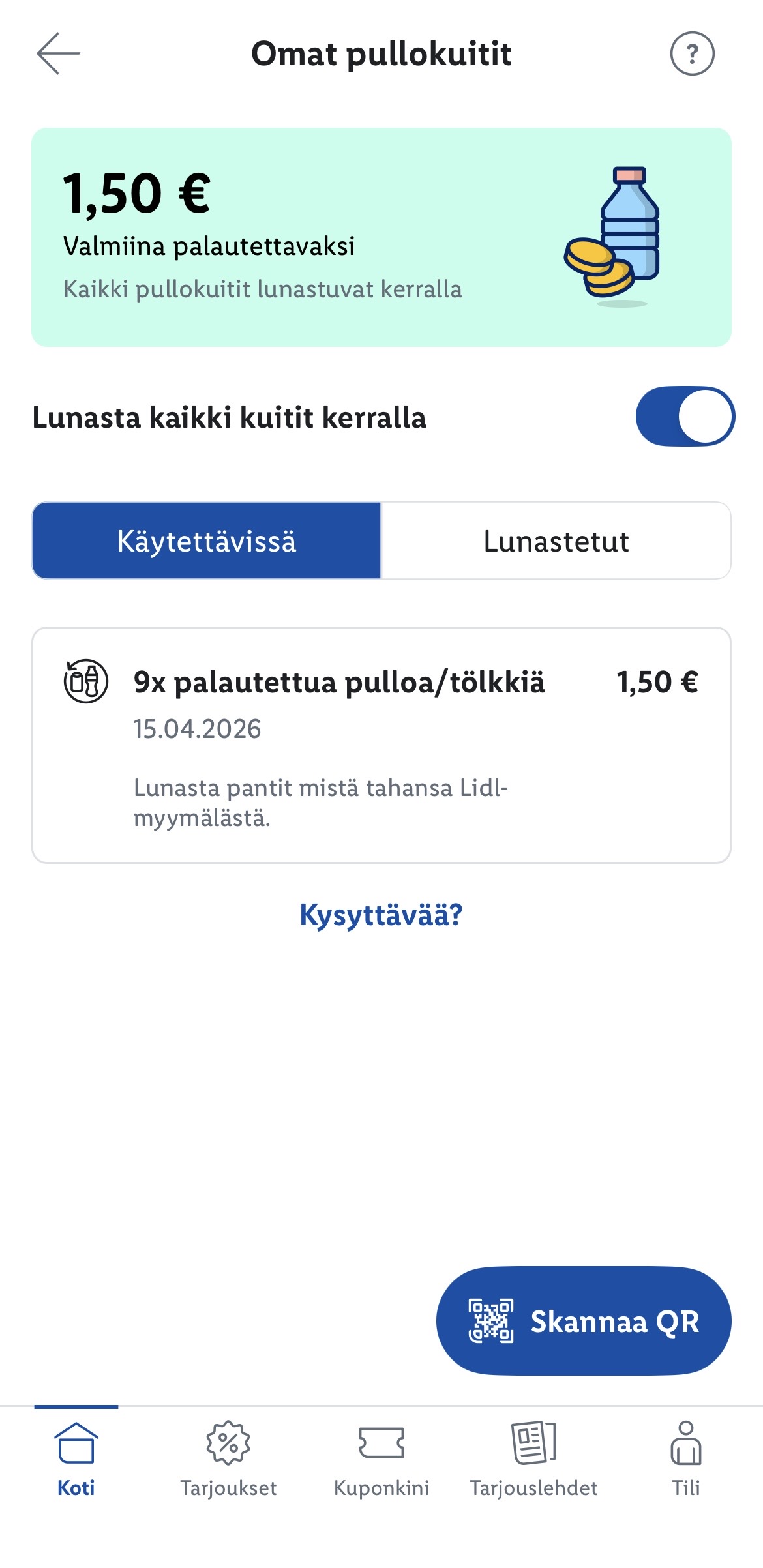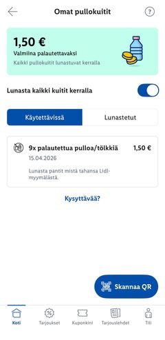 Toiminto on päivitetty kaikkiin Lidl Plus -sovelluksiin, mutta sovellus on suljettava ja avattava uudelleen ennen ensimmäistä palautuskertaa, jotta toiminto näkyy.