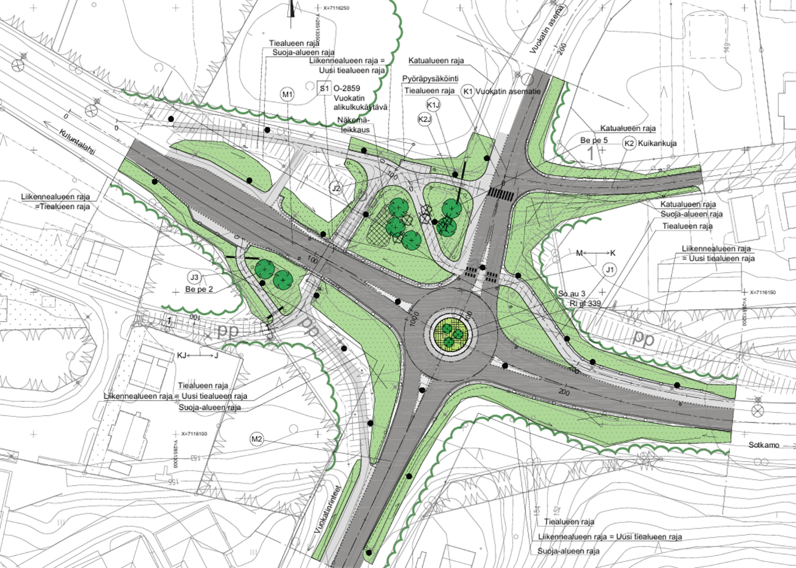 Liikenneympyrän rakennussuunnitelmakartta Vuokatin taajamassa.