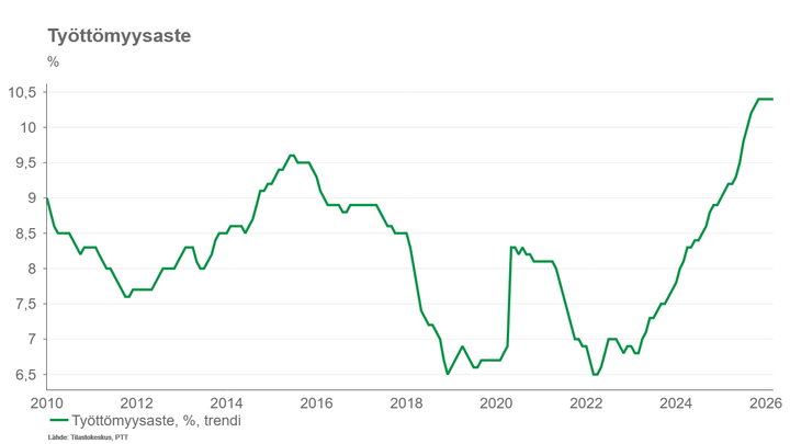 Tilastokeskuksen työvoimatutkimuksen mukaan 15–74-vuotiaita työllisiä oli vuoden 2026 maaliskuussa 22 000 vähemmän kuin vuosi sitten. Saman ikäisiä työttömiä oli 30 000 enemmän. 15–64-vuotiaiden työllisyysasteen trendiluku oli 71,0 %. 15–74-vuotiaiden työttömyysasteen trendiluku oli 10,4 %.