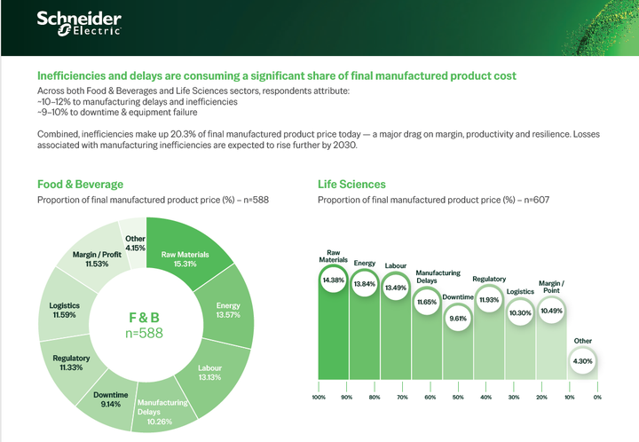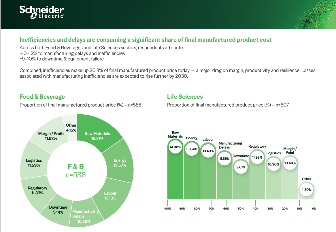 Tutkimus paljastaa, että päivittäistavaravalmistajat odottavat kannattavuuden heikkenevän. Viivästykset valmistuksessa, seisokit, laiteviat ja muut tehokkuutta heikentävät tekijät selittävät jo nyt arviolta 20,3 prosenttia lopputuotteen kustannuksista. 15,2 prosenttia tuotannon keskimääräisestä liikevaihdosta menetetään viivästysten, seisokkien, jälkityön, laatupoikkeamien tai tuotantoresurssien tavoitetasoa heikomman käytön vuoksi.