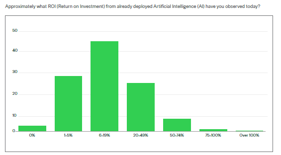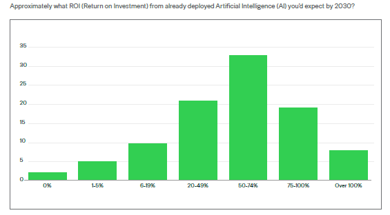 Vastaajista 70 prosenttia toisaalta arvioi, että tekoälyn tuotto on tällä hetkellä alle 20 prosenttia, ja lähes kolmannes (28,4 %) arvioi, että tuotto on 5 prosenttia tai vähemmän. Tämä kertoo siitä, että ala saa toistaiseksi vain vähän arvoa tekoälyn varhaisesta käyttöönotosta.