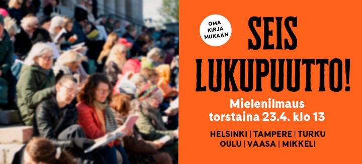 Suomalainen Kirjakauppa haluaa muuttaa suomalaisten heikentyneen lukutaidon suunnan. Kirjakauppa järjestää yhdessä 30 eri alan yhteistyökumppaninsa* kanssa toista vuotta peräkkäin Seis lukupuutto! -nimeä kantavan mielenilmauksen. Järjestäjät kutsuvat mukaan kaikki suomalaiset lukemaan yhdessä tunnin ajaksi Helsingissä, Turussa, Tampereella, Vaasassa, Mikkelissä ja Oulussa. Helsingissä mielenilmaus järjestetään Eduskuntatalon portailla ja muissa kaupungeissa kauppakeskuksissa tai niiden läheisyydessä, kuten torialueella*. Osallistujia ohjeistetaan ottamaan mukaan itselleen merkityksellinen kirja.