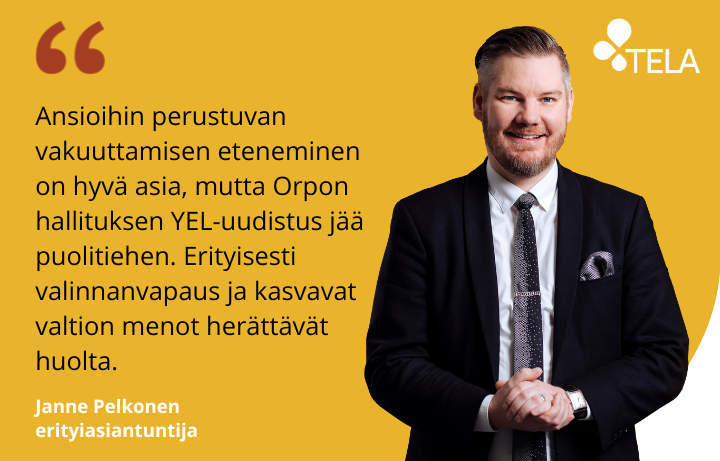 – On myönteistä, että hallitus vie yrittäjien eläkejärjestelmää kohti ansioihin perustuvaa vakuuttamista. Muutos on historiallinen, sillä todellisten ansioiden mukaan vakuuttaminen on vihdoin hyväksytty periaatteena YEL:ssä. Suunta on siis oikea, mutta nyt esillä oleva toteutus jää puolitiehen, sanoo Telan erityisasiantuntija Janne Pelkonen.