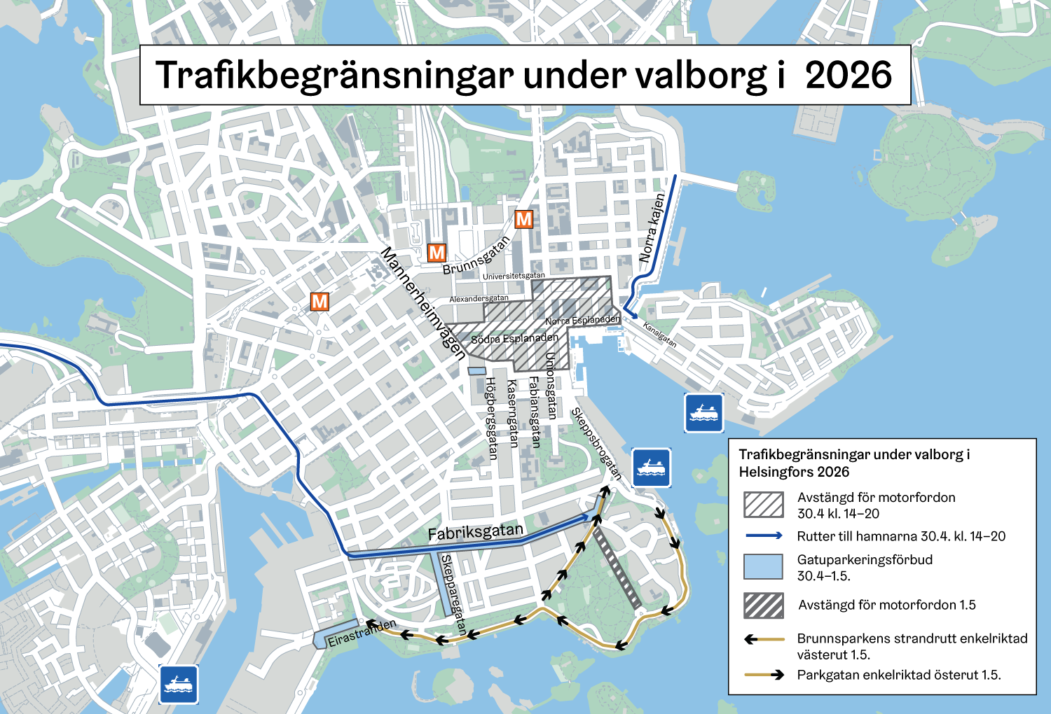 - Esplanaderna och sidogatorna är stängda för motorfordonstrafiken 30.4 kl. 14–20. Området har parkeringsförbud.