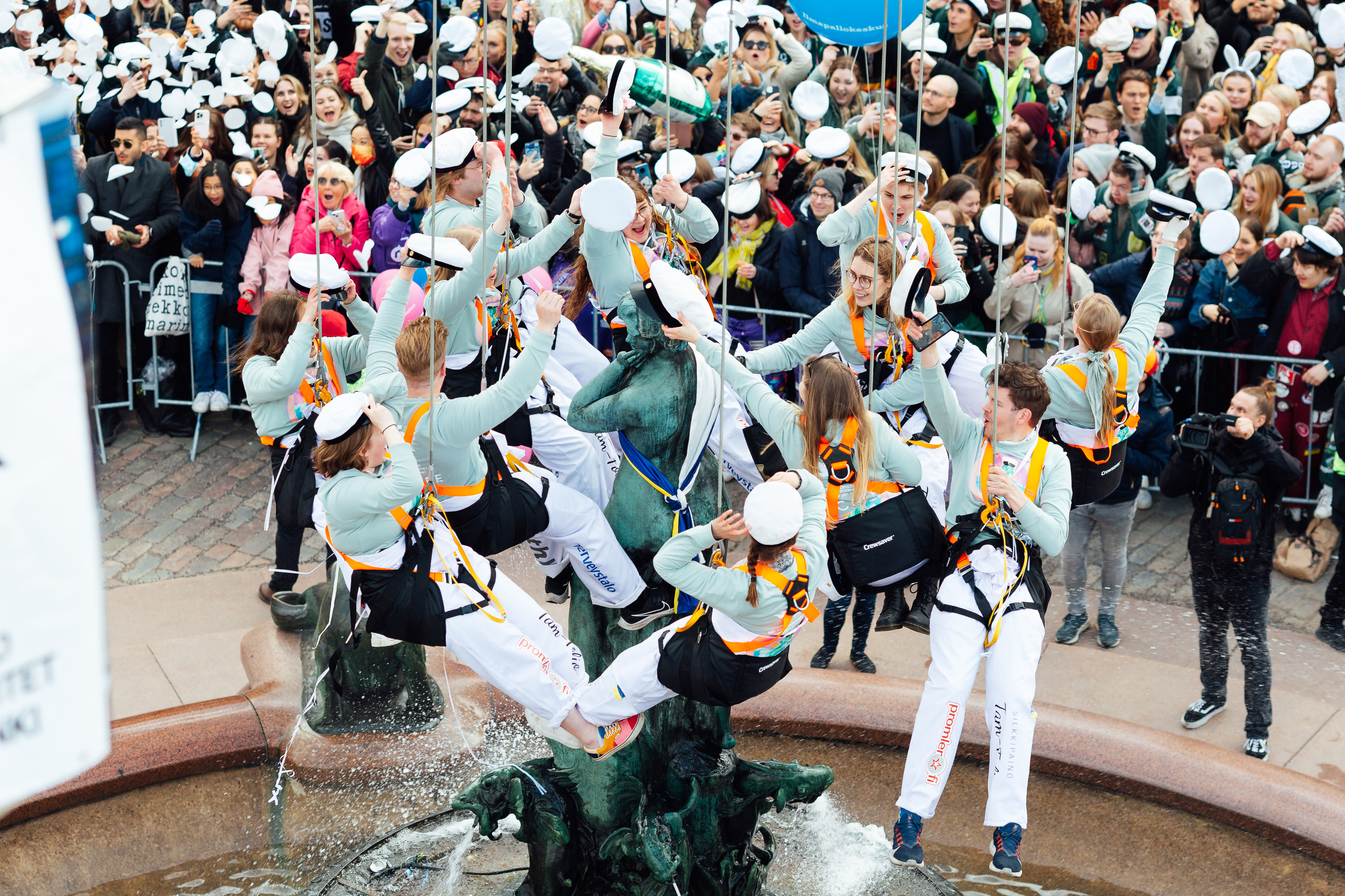 The Student Union of the University of Helsinki (HYY) will place a student’s cap on the head of the Havis Amanda statue at 6 pm in front of a crowd of thousands of people. However, festive atmosphere will already start filling the Havis Amanda square at 3.45 pm when the official programme at the square begins. The event will be opened by Mayor of Helsinki Daniel Sazonov with the mayor’s May Day greeting.