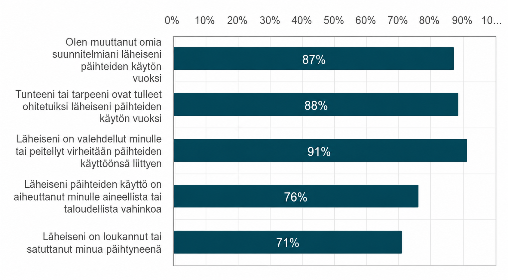 ”Olen toistuvasti joutunut muuttamaan omia suunnitelmiani ja arkeani läheiseni päihteiden käytön vuoksi. Omat tarpeeni, tunteeni ja rajani ovat jääneet toissijaisiksi tai tulleet ohitetuiksi”, kirjoittaa eräs vastaajista.