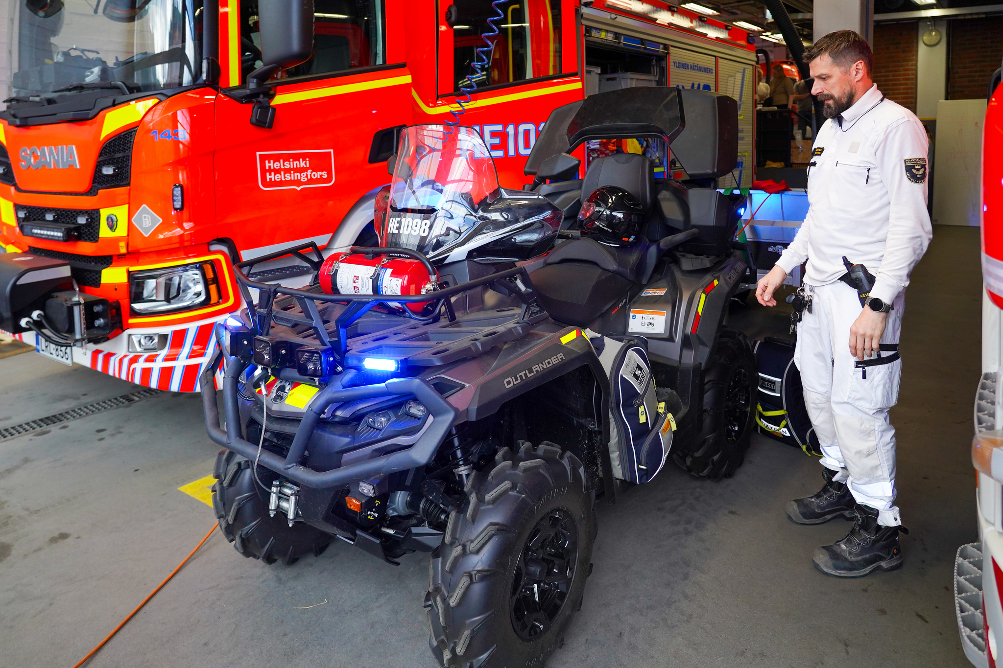 Palomies Jari Savela varusteli mönkijää Kallion keskuspelastusasemalla.