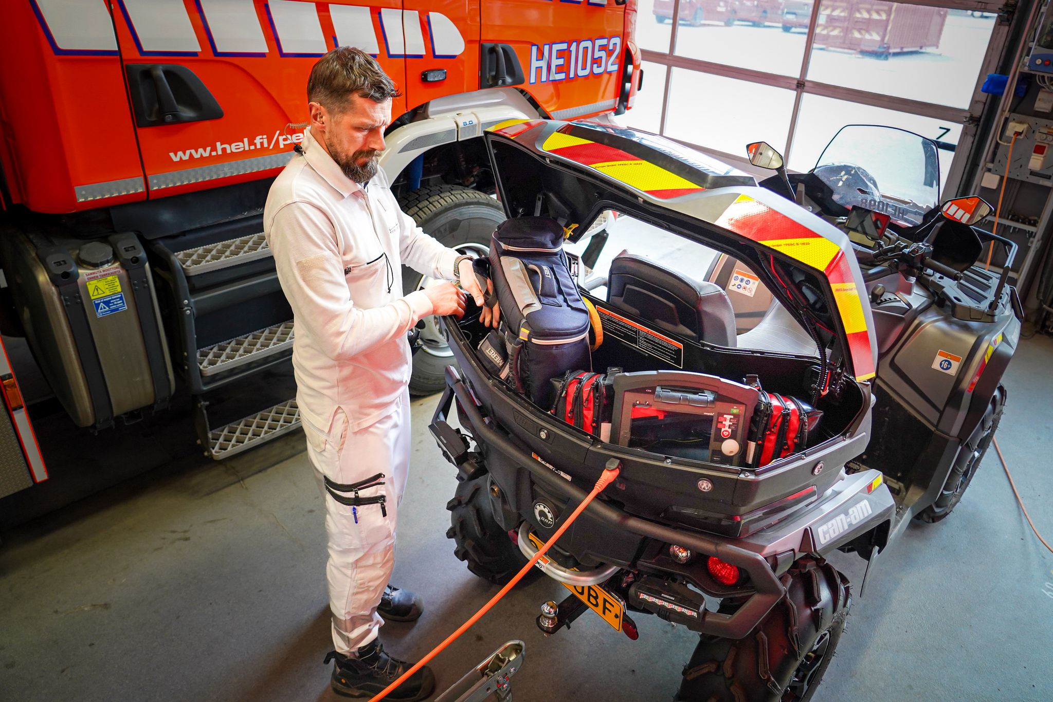 Palomies varustelee pelastusasemalla mönkijää, jonka takalaatikko on auki. Taustalla näkyy pelastusajoneuvo.