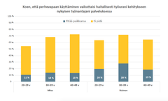 Joustoja kaivataan selvästi lisää, sillä esimerkiksi 30–39-vuotiaista miehistä alle puolet ja naisista reilu puolet arvioi, että oma työnantaja suhtautuu positiivisesti lyhennettyyn työaikaan.