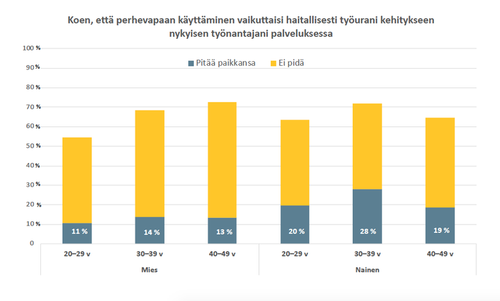Asenteiden lisäksi myös perhevapaajärjestelmää pitäisi rukata nykyistä joustavammaksi. Kaikista vastaajista neljä viidestä oli sitä mieltä, että perhevapaita pitäisi voida käyttää myös lasten ollessa vanhempia.