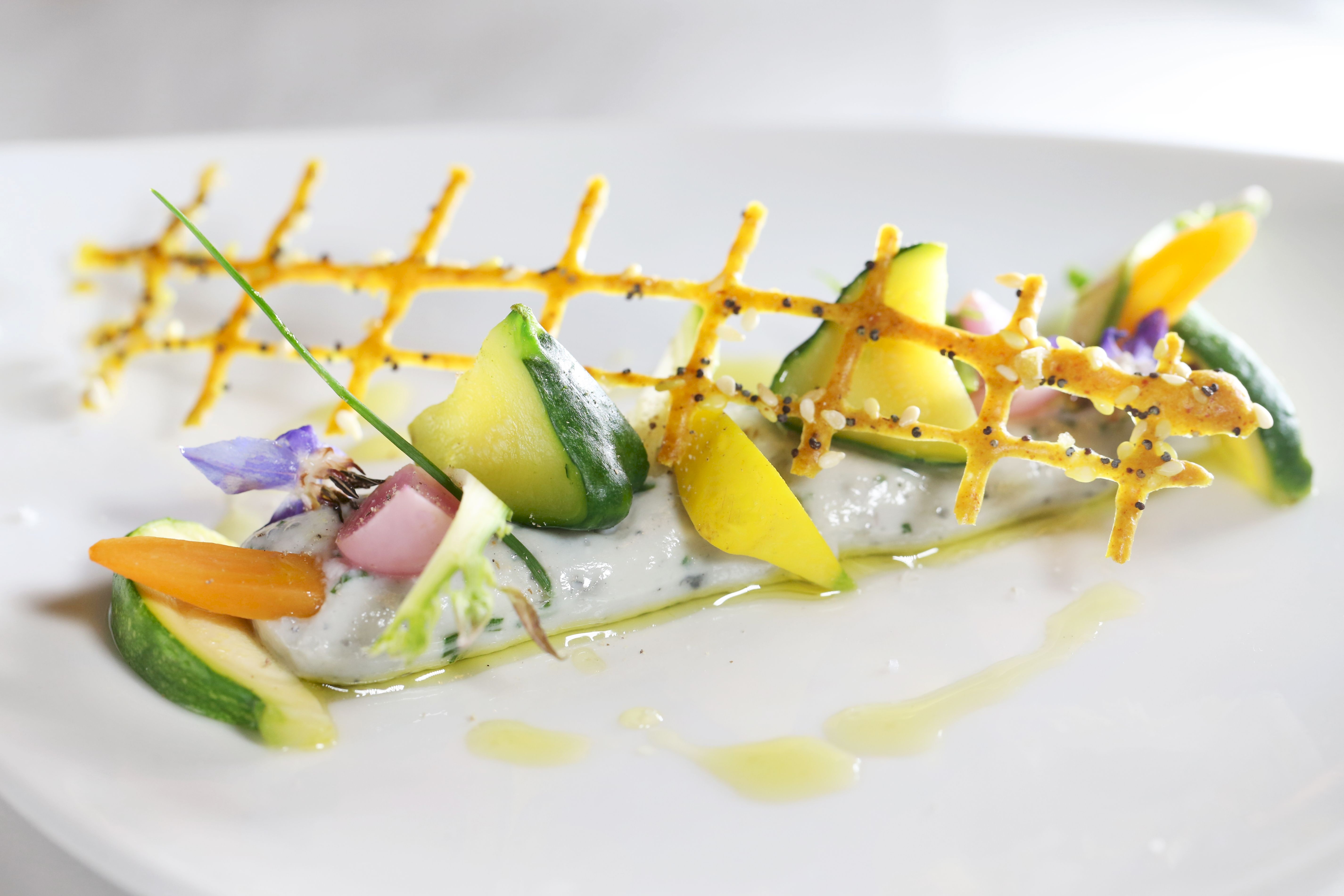 Annoksen kauneus ja värikkyys herättää ruokahalun. Alkuruoka-annos juhlaillallisilla