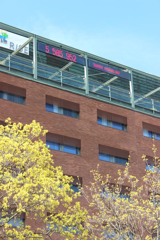 Valotaulu Digi- ja väestötietoviraston Helsingin palvelupaikan katolla 10.5.2023 (vaaka)