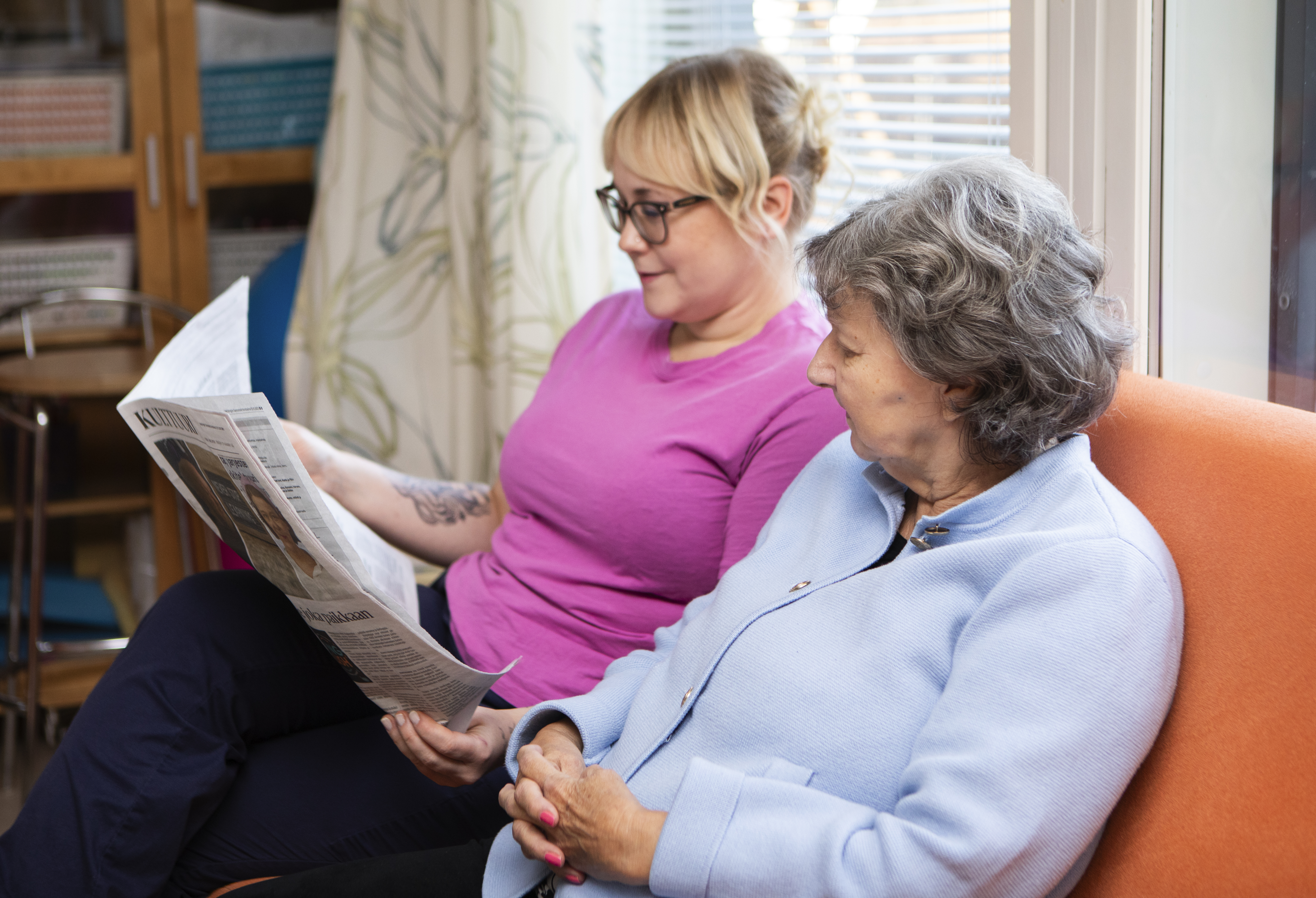 Mediapankki/Hoitaja ja asukas lukemassa lehteä Attendo-kodissa