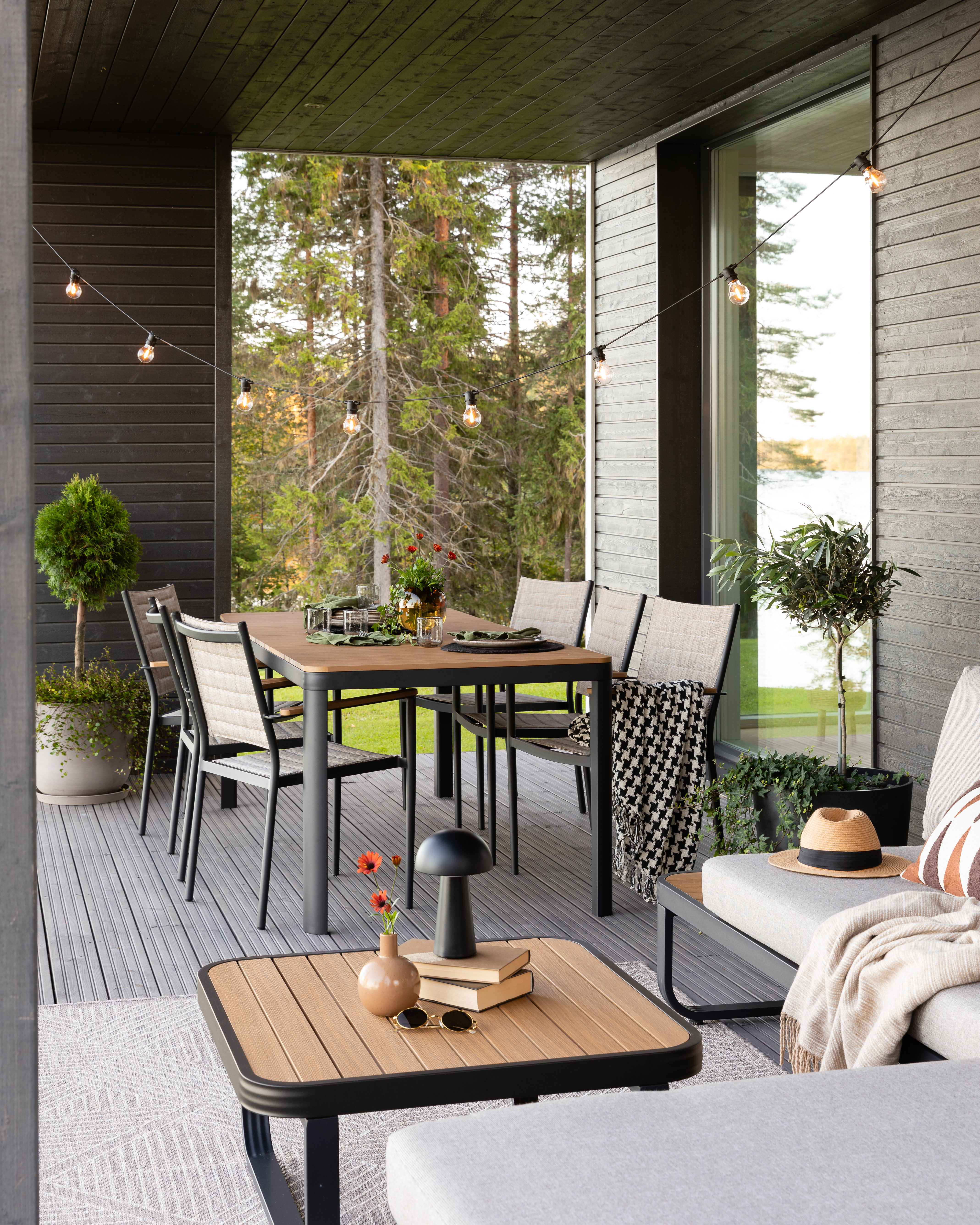 Haave 6-hengen ruokailuryhmä ja Lumme sohva ja sohvapöytä sopivat hyvin yhteen niin värien kuin muotojensa puolesta.