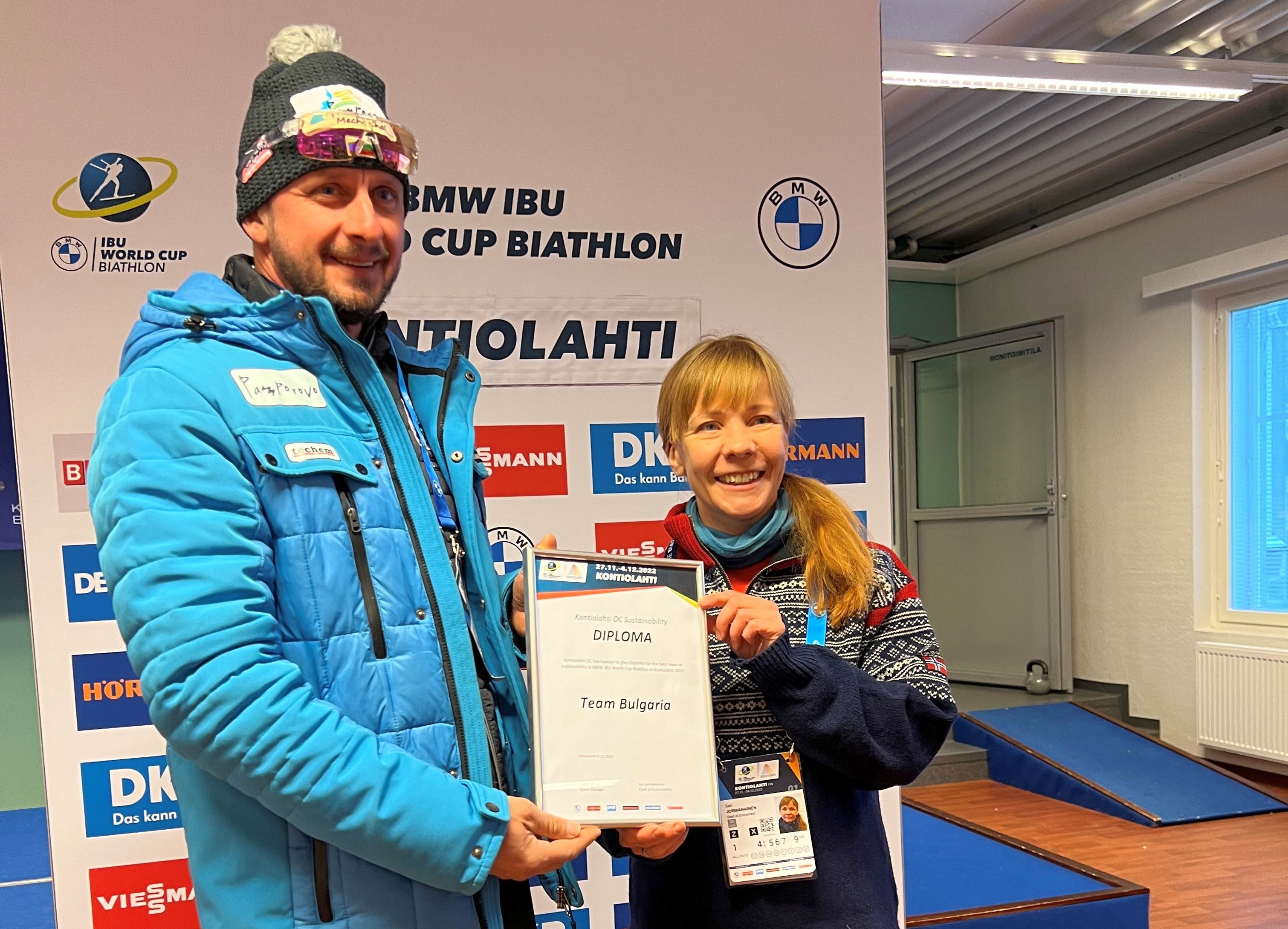 Ensimmäinen Bulgarialle. Bulgarian maajoukkue sai ensimmäisenä joukkueiden vastuullisuuspalkinnon, joka lanseerattiin vuoden 2022 maailmancup-tapahtumassa Kontiolahdella. Kunniakirjan äärellä päävalmentaja Krasimir Dochev ja tapahtuman vastuullisuuspäällikkö Sari Jormanainen.