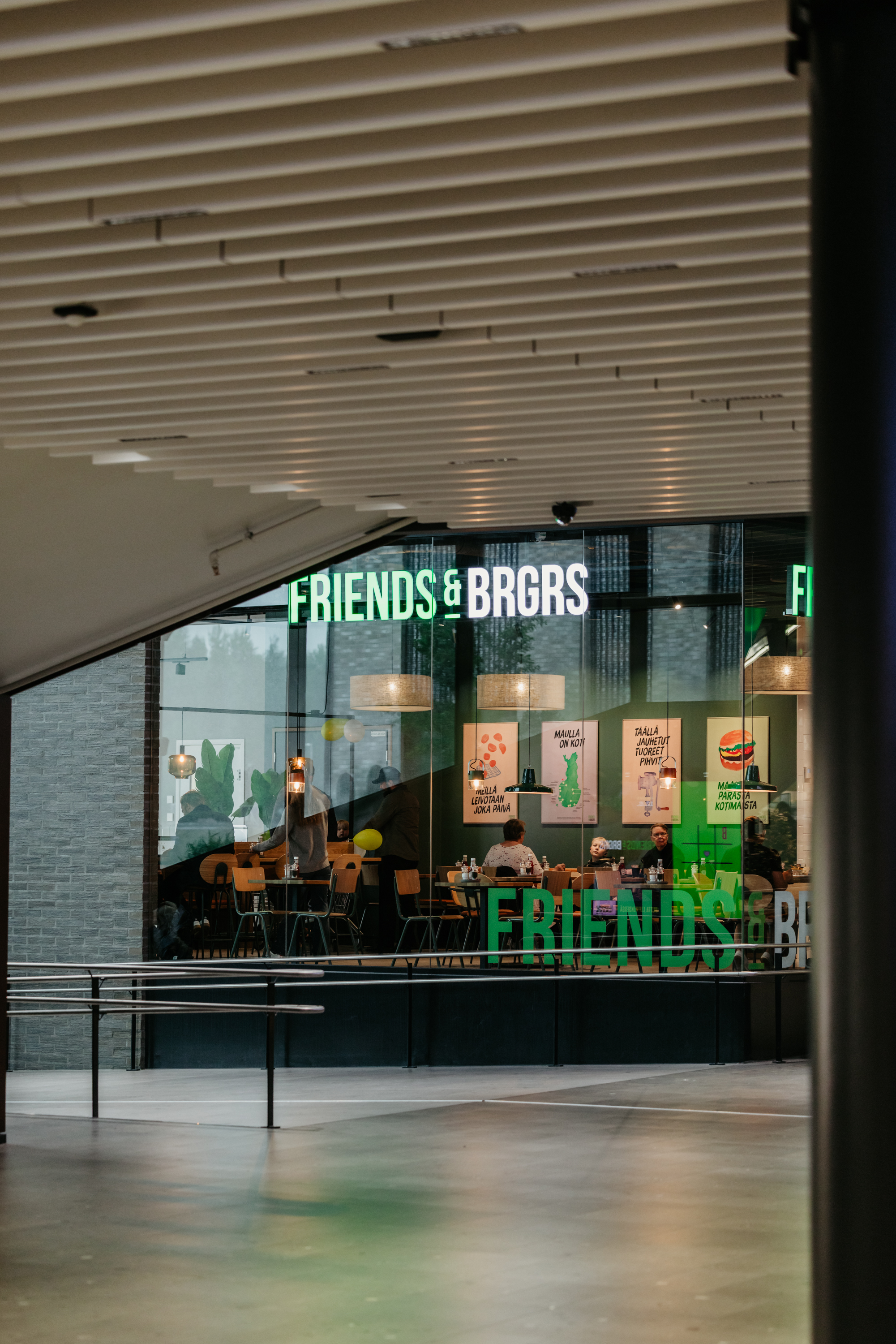 Suurten ikkunoiden takana Friends & Brgrs tarjoaa käsityönä valmistettuja hampurilaisia ja omassa leipomossa leivottuja sämpylöitä – näky, joka kutsuu poikkeamaan.