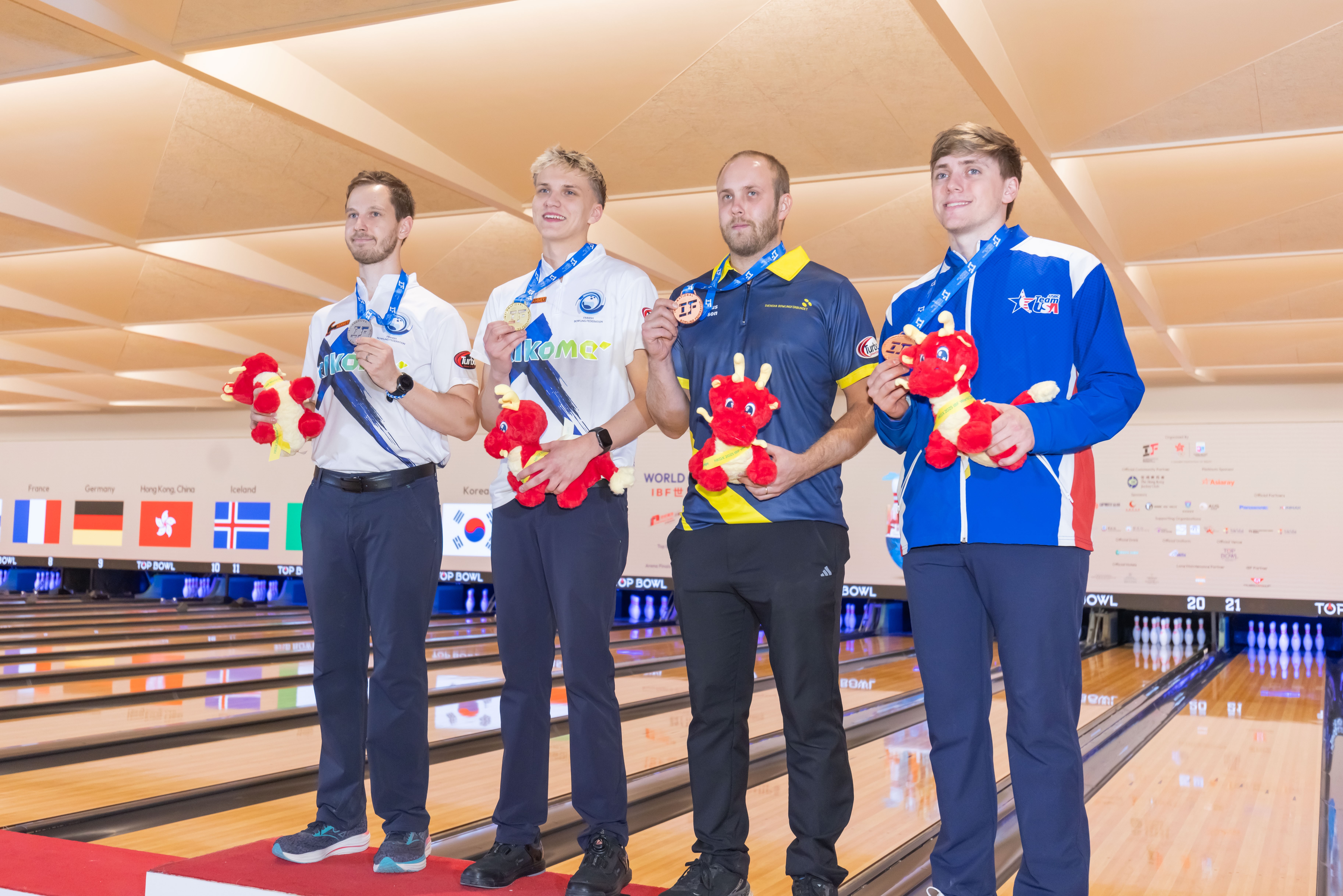 Hong Kongin MM-kisojen semifinaalinelikko. Vasemmalla finaalissa voiton ratkoneet suomalaiset Tomas Käyhkö ja Luukas Väänänen, oikealla semifinaaleissa suomalaisille taipuneet Ruotsin Markus Jansson ja Yhdysvaltojen Ryan Barnes.